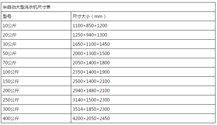 半自動工業(yè)洗衣機尺寸大小:目前市場中的半自動工業(yè)洗衣機,從容量10公斤至400公斤有多個規(guī)格,不同的容量,相應(yīng)的周身體積也是不同的。雖說不同的廠家在產(chǎn)品質(zhì)量、性能控制上略有差異,但產(chǎn)品的尺寸卻是大同小異的,下表就上海力凈為大家羅列出了10至400公斤不同容量的半自動工業(yè)洗衣機的尺寸大小表。