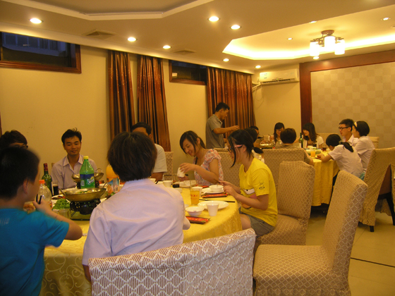 歡樂的時光總是走的特別快,不知不覺中已是夕陽西下了,戀戀不舍的我們離開了充滿無限魅力的碧海金沙,前往下一個目的地——洪廟大酒店。當我們抵達酒店的時候,公司已經(jīng)為我們準備好了滿滿幾桌的美酒佳肴。疲憊不堪的我們難以抵制美食的誘惑,很快就狼吞虎咽的吃起來了。美酒、佳肴、夜光杯,還有什么能比此時的我們更幸福呢?
